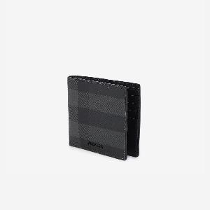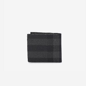 Bi-fold wallet in grey Check fabric with Burberry logo on the front. It features two bill compartments, eight card slots and two additional slip pockets.