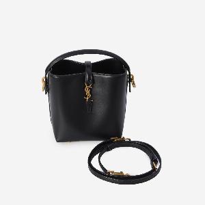 Le 37 bucket bag in black leather with Cassandre hook closure in gold-toned metal. It features leather handle, adjustable and removable leather strap, four metal feet on the bottom, one main internal scompartment and a suede lining.