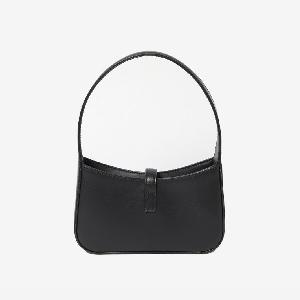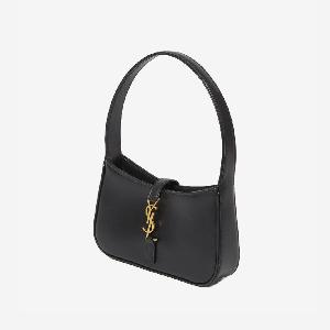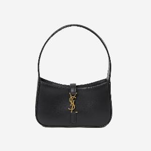 Le 5 à 7 Mini Hobo bag in black smooth calfskin with antique-gold metal YSL initials hook closure. It features fixed top handle, one main interior compartment and one interior card slot. Suede inner lining.