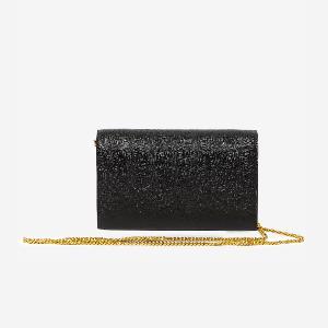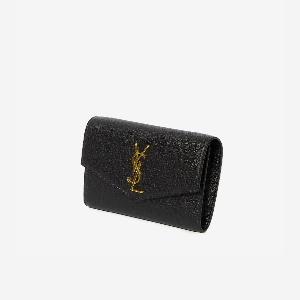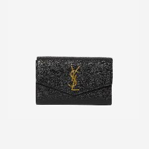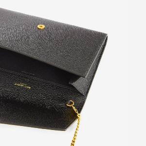 Uptown pouch in black grain de poudre grained calfskin with gold-tone metal YSL monogram on the front. It features adjustable and detachable chain shoulder strap, front flap with press-stud closure, one main interior compartment and one interior flat pocket. Detachable interior cardholder with three card slots.