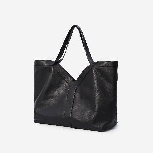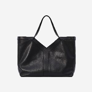Tote bag in finely grained black leather. Features fixed handles, hook closure, single compartment with zip pocket, and metal hardware.