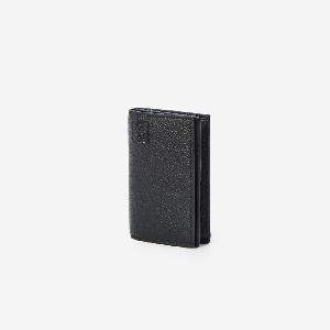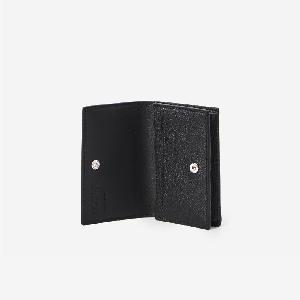 Cardholder in black pebbled calfskin. Features an embossed Anagram logo on the front, flap closure with snap button, front slot, and coin compartment.