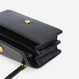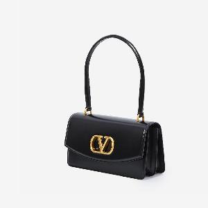 Black glossy calf leather bag. Features a fixed top handle, antique gold-tone metal VLogo, magnetic button closure on the flap, two internal compartments, a zip pocket, and card slots.