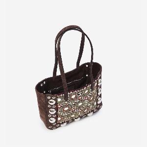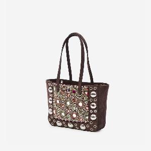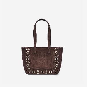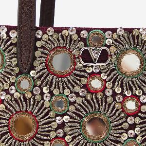 Dark brown suede leather bag. Features two fixed handles, spherical stud embellishments, rivets along the sides, and small mirrors on the front. Metal VLogo, one main compartment with a zip pocket.