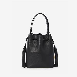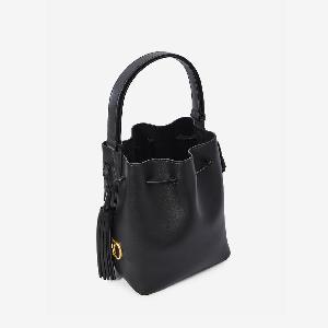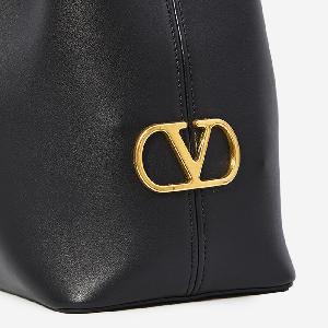 Black calf leather bucket bag. Features an adjustable handle with buttons, front drawstring closure with fringe detailing, lateral VLogo, and one main compartment. Equipped with additional black buttons for shoulder carry.