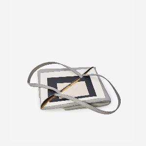 Grey calf nappa leather bag with inlaid squares inspired by Josef Albers' “Homage to the Square” series. Featuring two fixed top handles, one main compartment, and gold embossed logo. Suede leather lining.