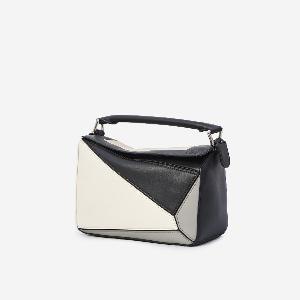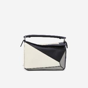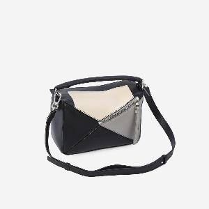 Small Square bag in mastic and black calfskin leather with inlaid squares inspired by Josef Albers' “Homage to the Square” series. Featuring an adjustable and removable strap, zip closure with calf leather pull, one external back zip pocket, one internal slip pocket, and suede lining. Embossed Anagram detail.