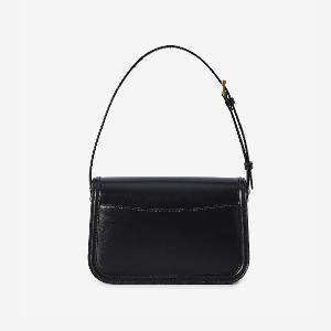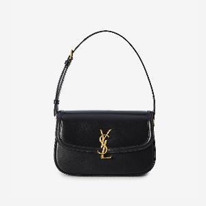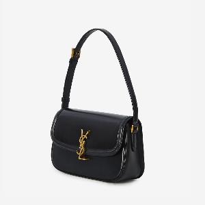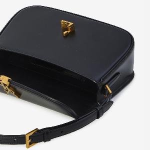 Black glossy leather shoulder bag. Features a flap with magnetic Cassandre snap closure, adjustable strap, one flat external pocket, a single central compartment, and one internal flat pocket.