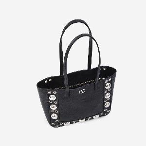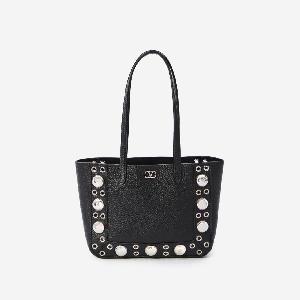 Black grained calf leather bag. Features two fixed top handles, spherical stud and rivet detailing along the sides, metal VLogo, and one main compartment with an internal zip pocket. Suede lining.
