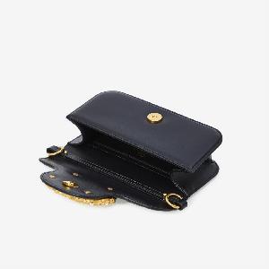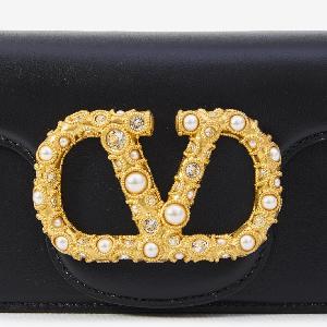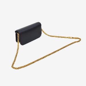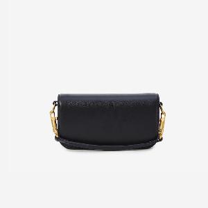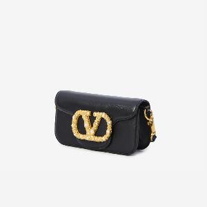 Black calf leather bag. Features a removable handle, removable chain shoulder strap, VLogo Signature jewel on the front, snap button closure, one main compartment with a flat pocket. Leather lining.