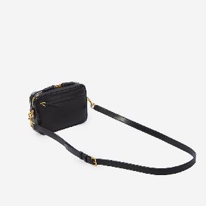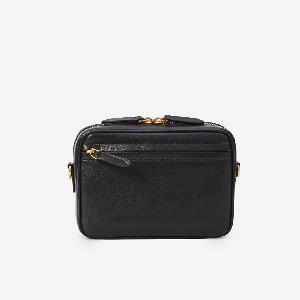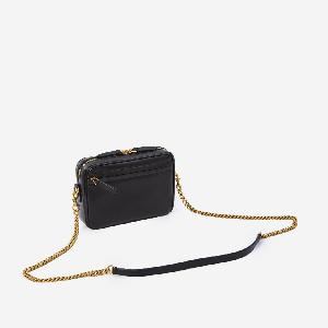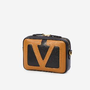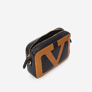 Black nappa leather bag with brown VLogo Signature. Features a removable chain shoulder strap, an adjustable and removable leather strap, one back zip pocket, zip closure, and one main compartment with three internal card slots. Leather lining.