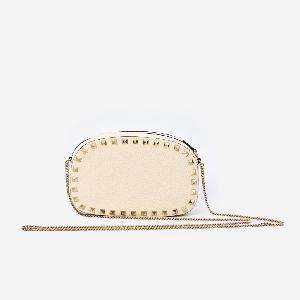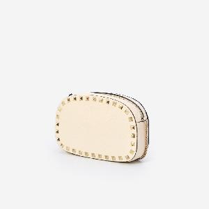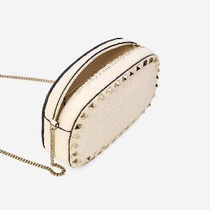 Ivory white grained calf leather bag. Features a chain shoulder strap, platinum-finish studs and hardware, zip closure, and one main compartment with two internal card slots. Leather lining.
