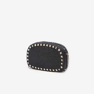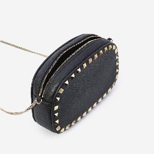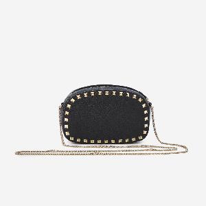 Black grained calf leather bag. Features a chain shoulder strap, platinum-finish studs and hardware, zip closure, and one main compartment with two internal card slots. Leather lining.