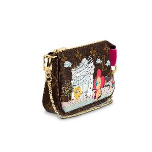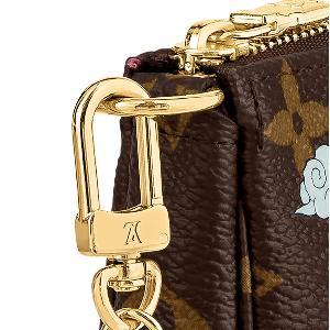 - Description : mini bag, zipper closure, gold finish, hand carried, detachable strap, all-over print, visible topstitching, decorative chain strap, single handle.