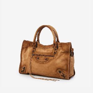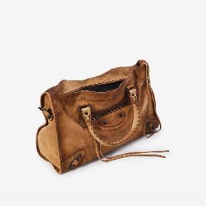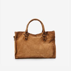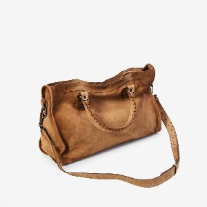 Bag in camel-colored suede calfskin leather. Features a waxed finish, two hand-braided top handles, an adjustable and removable shoulder strap, front zip pocket, zip closure with knotted leather pull, one main compartment with a zip pocket, and brass hardware. Cotton canvas lining.