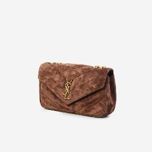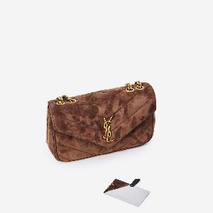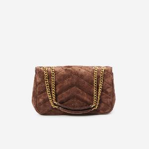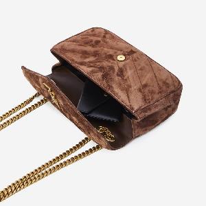 Bag in Coffee brown suede. Features iconic Chevron quilted topstitching, chain shoulder strap, magnetic closure with Cassandre detail, one main compartment, one flat pocket, a removable leather pouch, and a mirror. Cotton lining.