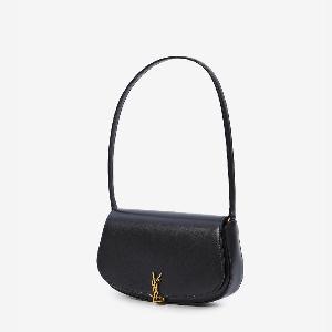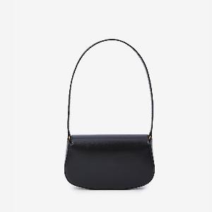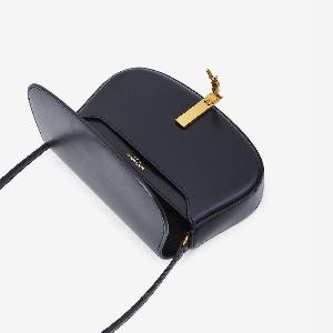 Half-moon bag in black calfskin leather with a slightly glossy finish. Features Cassandre magnetic closure with zipper, one flat pocket, one main compartment with flat pocket, and bronze-tone hardware. Leather lining.