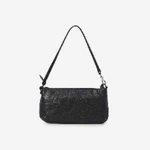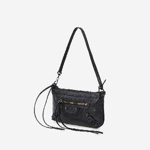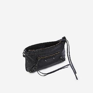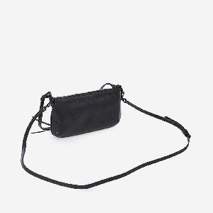 Black lambskin Arena Storico Bag. Features an adjustable and removable shoulder strap, brass hardware, studs and a brass buckle detail, a front zip pocket with knotted leather pull, one main internal compartment, and six internal card slots.