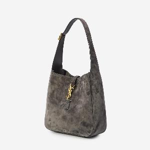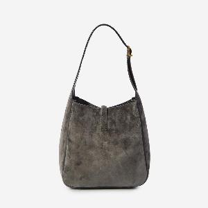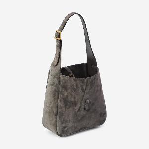 Le 5 à 7 small bag in grey-colored suede. Features a hook closure with bronze-toned metal Cassandre, adjustable top handle, one main interior compartment, and one internal zip pocket. Suede lining.