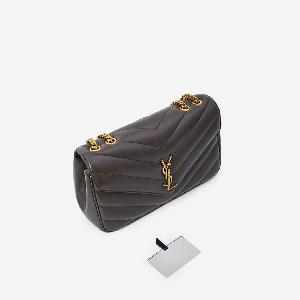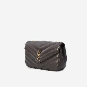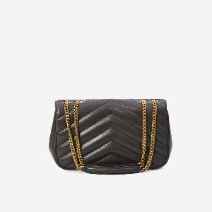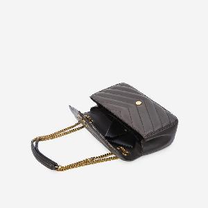 Soft lambskin bag with black chevron quilted stitching. Features bronze-toned metal Cassandre signature details, snap magnetic closure, grosgrain lining, one main compartment, a removable leather pouch, a mirror, and a sliding chain strap.