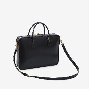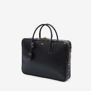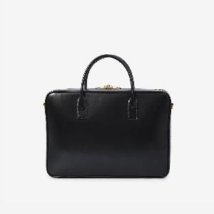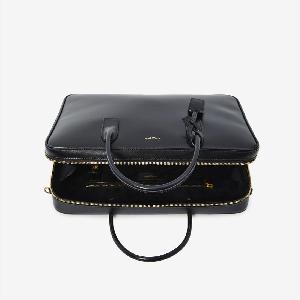 Black smooth calfskin leather bag. Features two fixed top handles, an adjustable and removable shoulder strap, double-zip closure, one gusseted pocket, one zip pocket, and one flat pocket inside. Comes with an exterior padlock, suede lining, and bronze-tone metal hardware.