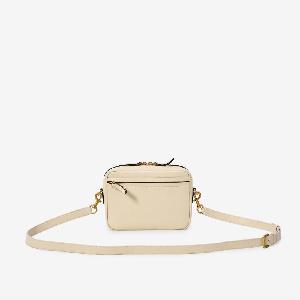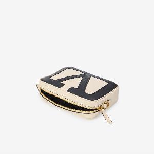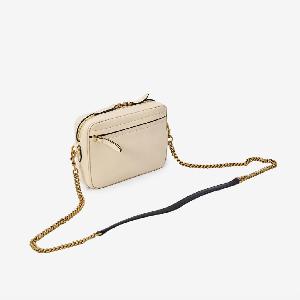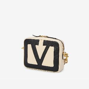 Ivory nappa leather bag with black VLogo Signature. Features a removable chain shoulder strap, an adjustable and removable leather strap, one back zip pocket, zip closure, and one main compartment with three internal card slots. Leather lining.