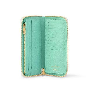 - Description : Signature initials in tone-on-tone metal, zipped closure, 12 card slots, 2 additional business card slots, large gusseted bill compartment, zipped coin compartment, compartment for papers and receipts.