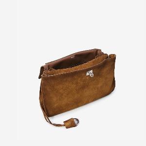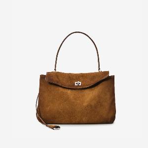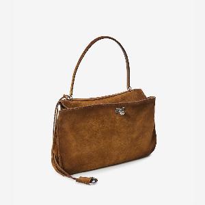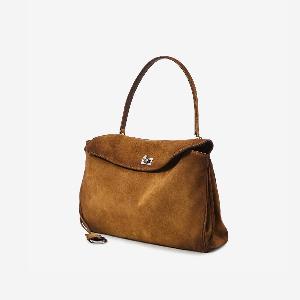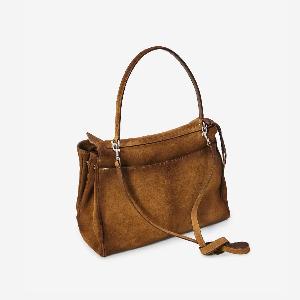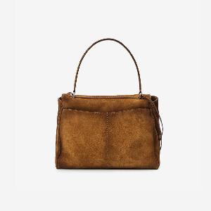 Medium Rodeo bag in camel waxed suede calfskin. Featuring a single top handle, removable shoulder strap, removable key holder with two split rings, two flat pockets on the back, turn-lock closure, two adjustable interior compartments with external snap button, one internal zip pocket, smooth leather lining, and metal feet.