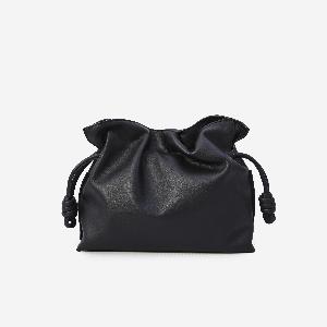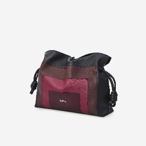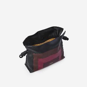Flamenco Square bag in calf nappa in black and burgundy, featuring intarsia squares inspired by Josef Albers' Homage to the Square series. Features an adjustable and removable shoulder strap, drawstring closure with iconic Knots, magnetic fastening, one main compartment, and a suede interior.