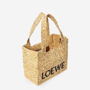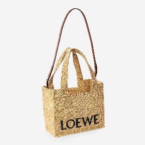 Natural raffia bag with leaves from Madagascar. Features two fixed top handles, LOEWE signature on the front, an adjustable and removable leather shoulder strap, one main compartment, and one flat internal leather pocket.
