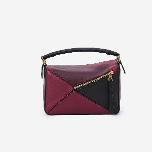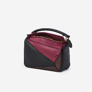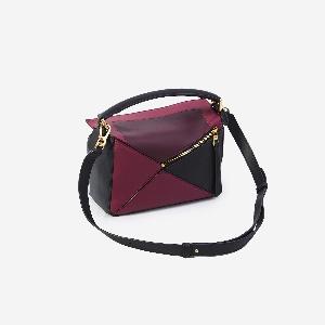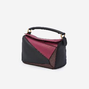 Small Square bag in black and burgundy calfskin leather with inlaid squares inspired by Josef Albers' “Homage to the Square” series. Featuring an adjustable and removable strap, zip closure with calf leather pull, one external back zip pocket, one internal slip pocket, and suede lining. Embossed Anagram detail.
