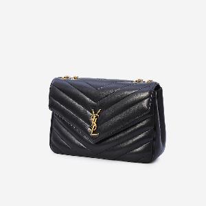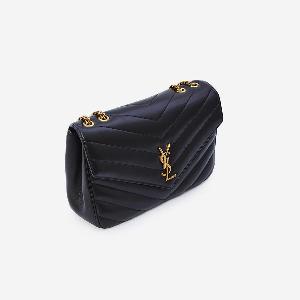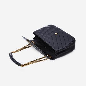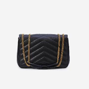 Bag in soft black lambskin leather with chevron quilting. Features a sliding chain shoulder strap, automatic magnetic closure with bronze-colored Cassandre hardware, main compartment with a flat pocket, removable leather pouch, and interior mirror, with grosgrain lining.