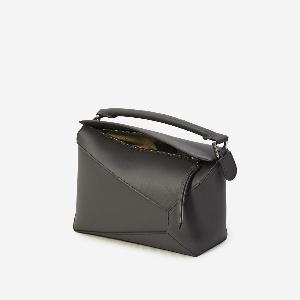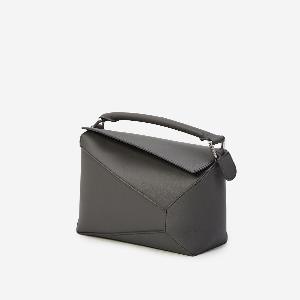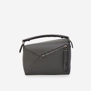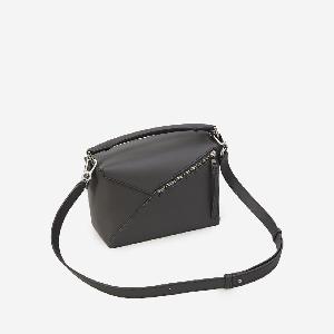 Slate grey calfskin leather bag featuring a geometric, cubic design. Can be worn over the shoulder, crossbody, or carried by hand. Features an adjustable and detachable shoulder strap, zip closure with leather puller, external back zip pocket, internal open pocket, and cotton canvas lining. Embossed Anagram motif.