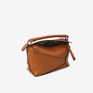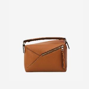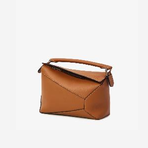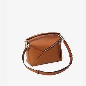 Tan brown calfskin leather bag featuring a geometric, cubic design. Can be worn over the shoulder, crossbody, or carried by hand. Features an adjustable and detachable shoulder strap, zip closure with leather puller, external back zip pocket, internal open pocket, and cotton canvas lining. Embossed Anagram motif.