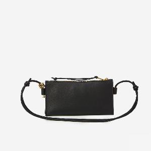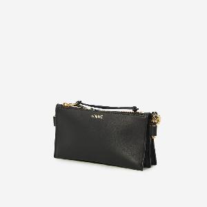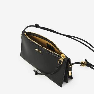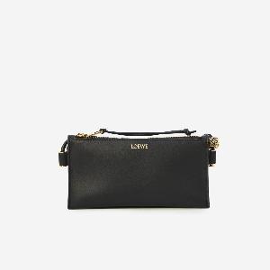 Black calfskin nappa bag. It features a gusset construction, adjustable tubular shoulder strap, metal Anagram detail in gold, LOEWE signature on the front, zip closure with a calfskin zipper pull, one main compartment, and a suede lining.