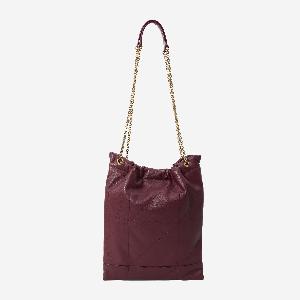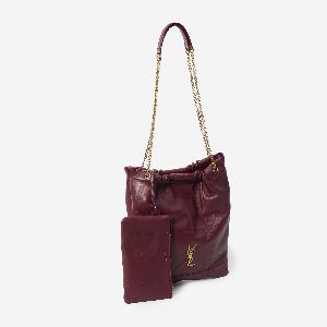 Bag in Merlot red lambskin nappa leather with Carré Rive Gauche quilting. Features two sliding chain handles, drawstring and magnetic button closure, Cassandre detail on the front, main compartment, and removable zippered pouch.