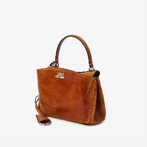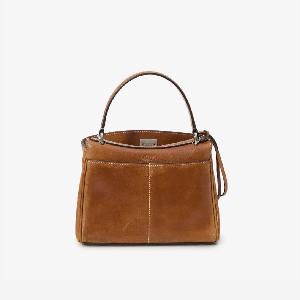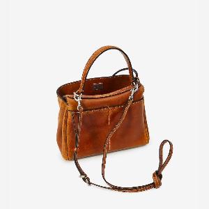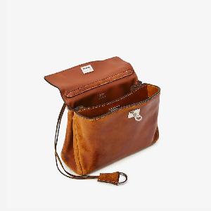 Light brown vegetable-tanned lambskin bag. It features a top handle, an adjustable and removable shoulder strap, a removable keychain with double spiral rings, metal feet, two flat pockets on the back, snap buttons on the sides, a swivel closure, a large front pocket, one main compartment, and an open internal pocket.