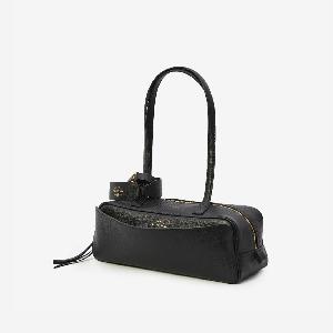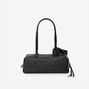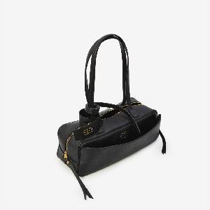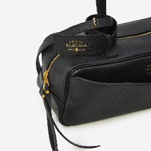 Black grenadine calfskin bag. It features two top handles with a clip, a removable travel tag, metal feet, a large front pocket with an embossed logo, double-zip closure with leather zipper pulls, one main compartment, an internal zip pocket, lambskin lining, and antiqued gold hardware.