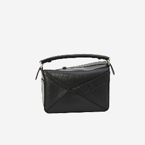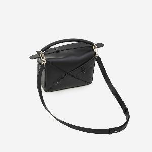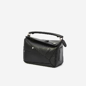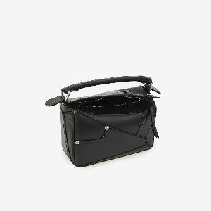 Black glossy calf leather bag with denim-inspired details, reminiscent of pants. It features a geometric design and a cubic shape, an adjustable and removable shoulder strap, a front flat pocket, a side flat pocket, flap and zip closure, one main compartment, an internal flat pocket, and herringbone cotton canvas lining.