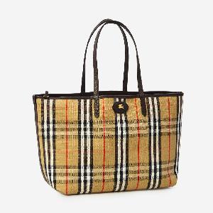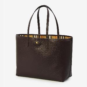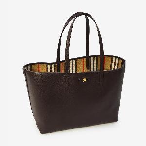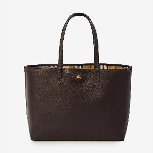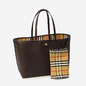 Reversible tote bag in burgundy brown calfskin on one side and fabric with the Check pattern on the other. Features two top handles, an Equestrian Knight Design leather label on the front, one main interior compartment, and a removable pouch.