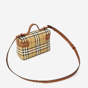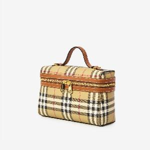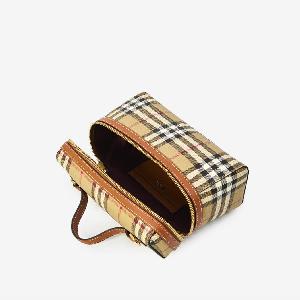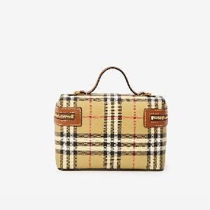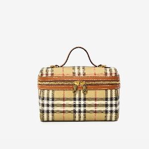 Vanity bag in fabric with the classic Burberry Check beige archive pattern all over, complemented by brown leather trims. Features a top handle, adjustable and removable leather shoulder strap, double-zip closure, one main compartment, two card slots, and a cotton lining.
