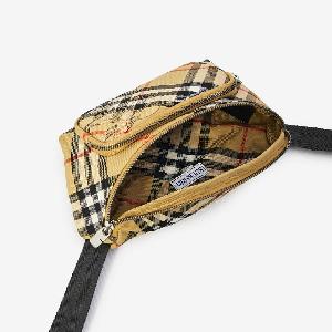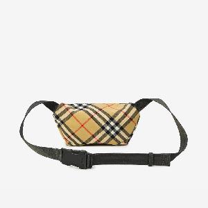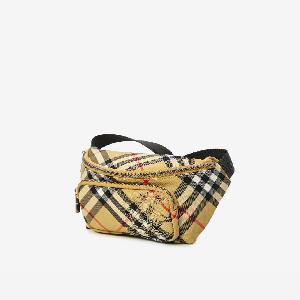 Beige sand Burberry Check fabric waist bag with Equestrian Knight Design decoration on the front. It features an adjustable webbing strap, a front zip pocket, and a main compartment with a zip closure. Unlined model.