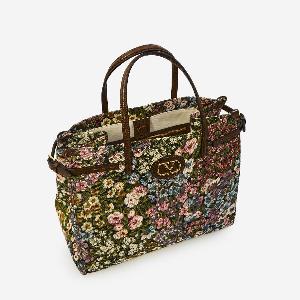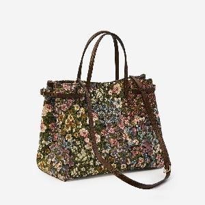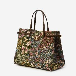 Valentino Garavani shopping bag in jacquard fabric with a multicolor Après L'Hiver motif. It features two leather top handles, adjustable buckles on the sides to modify the bag's capacity, an adjustable and removable shoulder strap, metal feet, a leather patch with a VLogo Signature in metal, a magnetic closure, one main compartment, and a canvas lining.