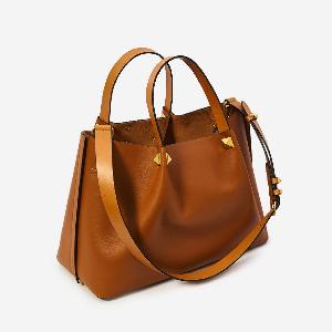 Camel-colored smooth calfskin tote bag. It features two fixed top handles, an adjustable and removable shoulder strap, metal feet, a gold-tone metal VLogo Signature on the front, large gold-tone Rockstud spikes, one main compartment, a removable leather pouch, and a suede leather lining.