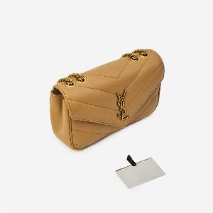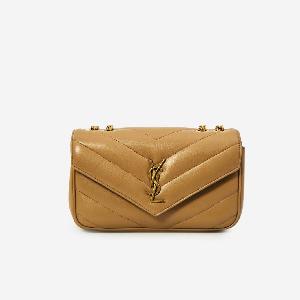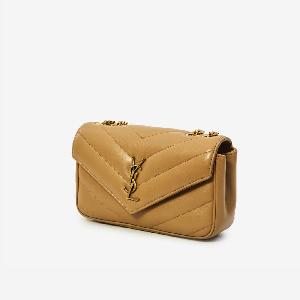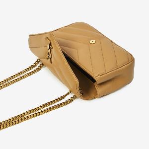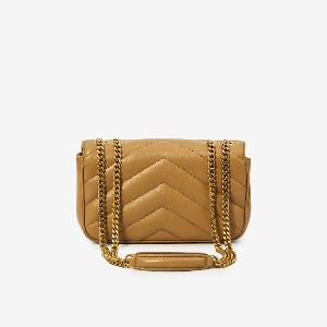 Beige soft lambskin bag with chevron quilted stitching. Features bronze-toned metal Cassandre signature details, snap magnetic closure, grosgrain lining, one main compartment, a removable leather pouch, a mirror, and a sliding chain strap.