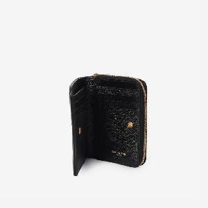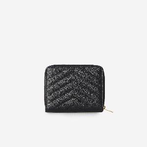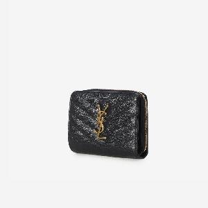 Compact wallet in black embossed leather with matelassé stitching and interlaced YSL initials in gold-tone metal on the front. It features six card slots, a coin pocket, a bill compartment, and four receipt compartments.