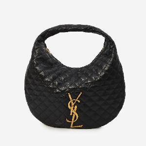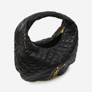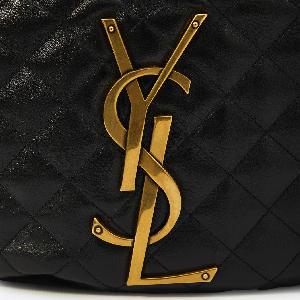 Black lambskin bag with quilted diamond stitching. Featuring a top handle, a bronze-tone metal Cassandre detail on the front, zip closure, one main compartment, a zip pocket inside, and leather lining.