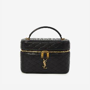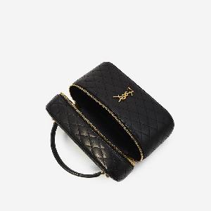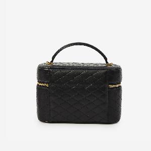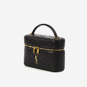 Black lambskin vanity bag with quilted diamond stitching. Featuring a top handle, an adjustable and removable shoulder strap, a metal Cassandre detail applied on the front, double-zip closure, one main compartment, and a flat internal pocket.