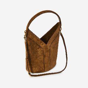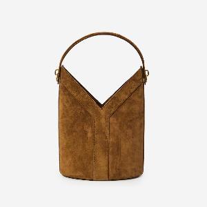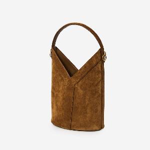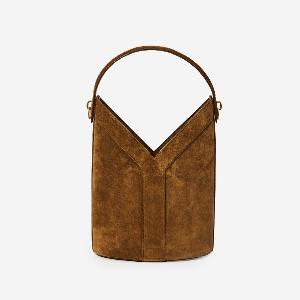 Long bucket bag in caramel brown suede calf leather. Featuring a fixed top handle, an adjustable and removable shoulder strap, a tonal Y detail, a smooth leather base, one main compartment, a zip pocket inside, and a suede leather lining.
