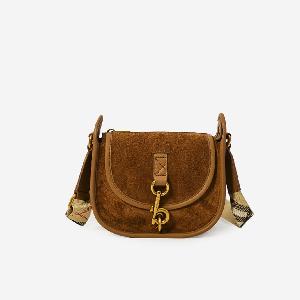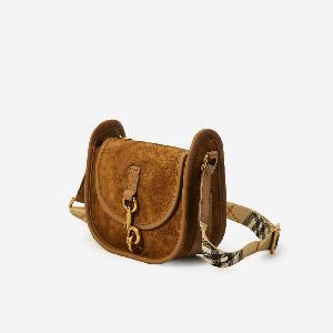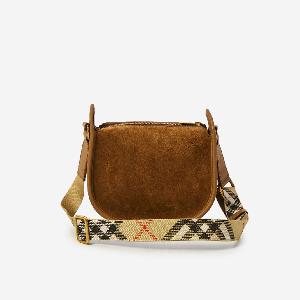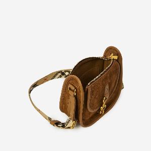 Crossbody bag in Hazel brown suede calf leather. It features an adjustable webbing shoulder strap with a Check pattern, Equestrian Knight Design embossed on the back, an external pocket with a B-shaped clasp, an internal slip pocket, a zip closure, one main compartment, and an internal pocket. Lined with burgundy leather.